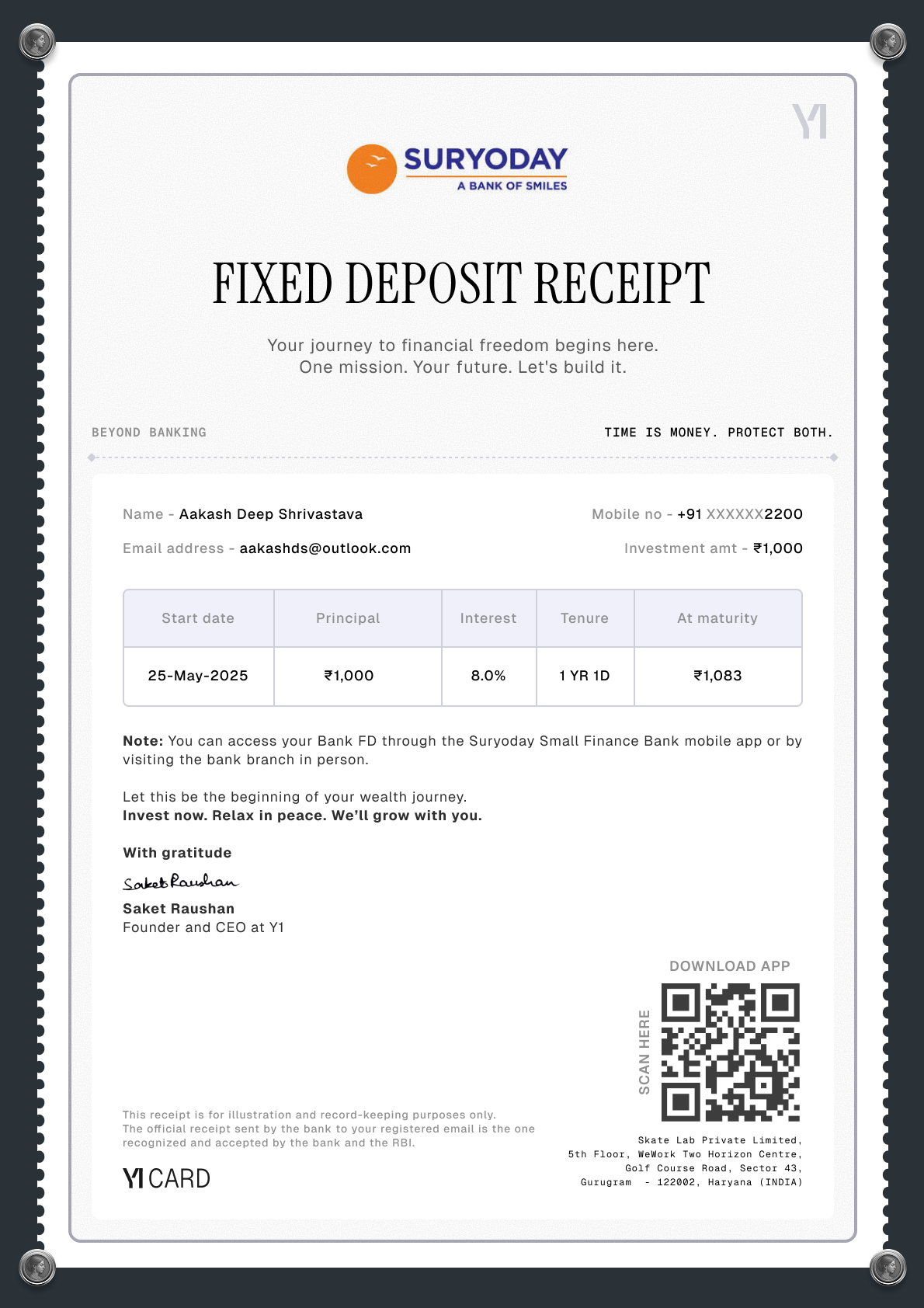 in bank fixed deposits & recuring deposits by Suryoday Small FInance Bank.